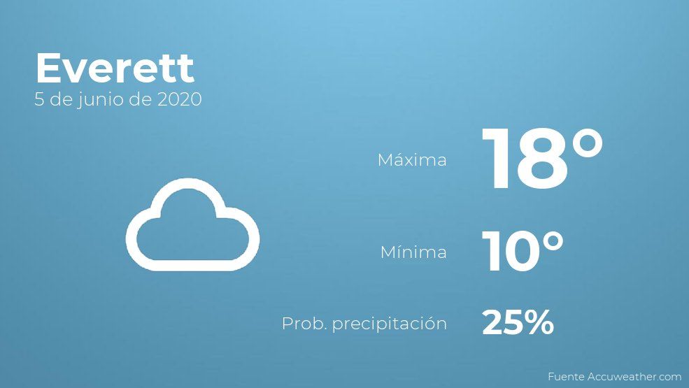 Hoy por la mañana en Everett habrá cielos nubosos con poca probabilidad de precipitaciones. Por la tarde estará muy nublado con probabilidad de algún episodio de precipitaciones aisladas. En cuanto a las temperaturas, estas se moverán entre una máxima de 18 y una mínima de 10 grados. Junto a todo esto, se esperan vientos del noroeste sin apenas intensidad con cifras de hasta 15 kilómetros por hora.