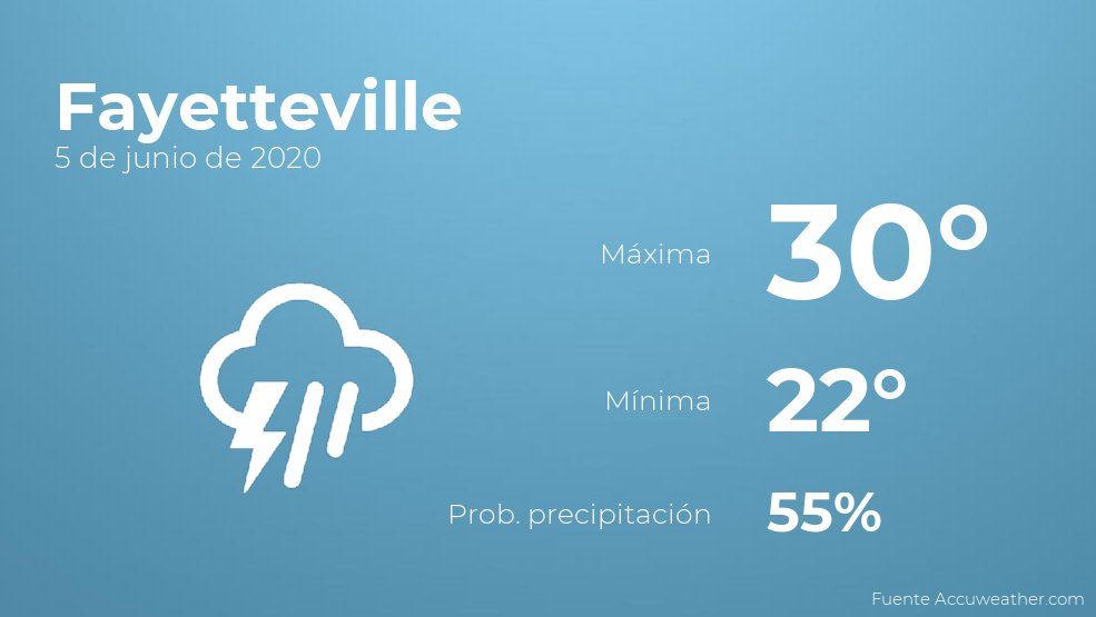 Para las primeras horas del día en Fayetteville el cielo estará cubierto con probabilidad de tormentas y lluvia. Por la tarde tendremos nubes y claros con poca probabilidad de lluvias. En relación a las temperaturas, estas oscilarán entre una máxima de 30 y una mínima de 22 grados centígrados. Viento de poca intensidad con valores de hasta 22 kilómetros por hora.