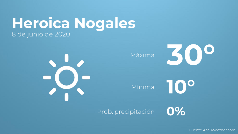 Para el día de hoy en Heroica Nogales se prevén cielos sin nubes. Las temperaturas estarán entre una máxima de 30 y una mínima de 10 grados. Además, se esperan vientos de poca intensidad con valores de hasta 24 kilómetros por hora.