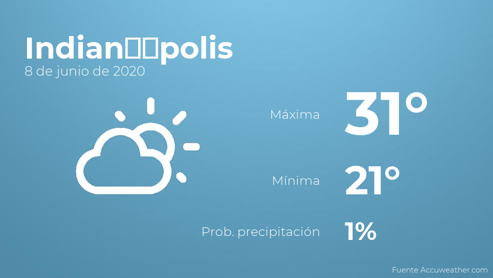 Hoy a primera hora en Indianápolis se esperan pocas nubes. A medida que avance el día tendremos nubes y claros. Con respecto a las temperaturas, oscilarán entre una máxima de 31 y una mínima de 21 grados centígrados. En general, vientos de carácter flojo con rachas de hasta 20 km/h.