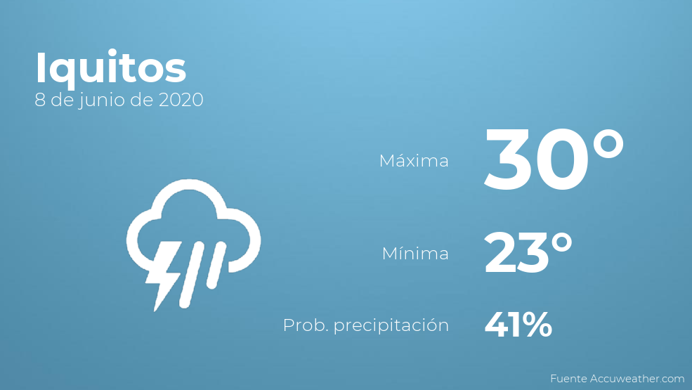 Hoy por la mañana en Iquitos el cielo estará cubierto con probabilidad de tormentas y lluvia. Por la tarde tendremos más nubes que claros con baja probabilidad de que haya precipitaciones. En relación a las temperaturas, estas variarán entre una máxima de 30 y una mínima de 23 grados centígrados. Junto a todo esto, se esperan vientos de poca intensidad con cifras de hasta 11 km/h.