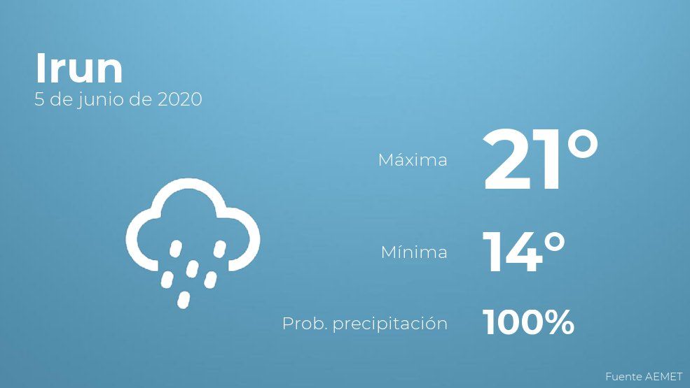Para las primeras horas del día en Irun el cielo estará cubierto con lluvia. Según pasen las horas estará muy nublado con lluvia. Con respecto a las temperaturas, estas oscilarán entre los 21 grados de máxima y 14 de mínima. Junto a todo esto, se esperan vientos del oeste de carácter flojo.