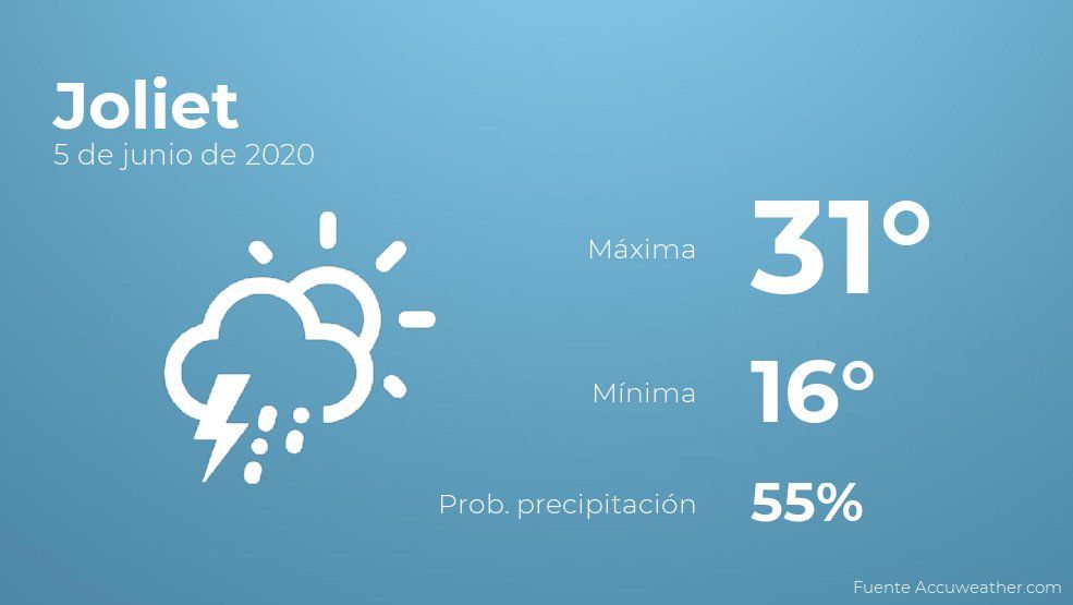 Para hoy por la mañana en Joliet tendremos nubes y claros con probabilidad de tormentas y lluvia. Por la tarde se esperan nubes y claros. En relación a las temperaturas, estas variarán entre una máxima de 31 y una mínima de 16 grados centígrados. Además, se esperan vientos de poca intensidad con cifras de hasta 17 kilómetros por hora.