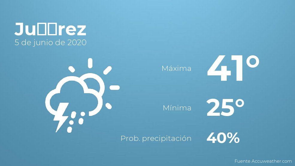 Para hoy por la mañana en Juárez se prevén nubes y claros con probabilidad de tormentas acompañadas de lluvia. Según pasen las horas tendremos nubes y claros con poca probabilidad de lluvias. En relación a las temperaturas, estas se moverán entre los 41 grados de máxima y 25 de mínima. Además, se esperan vientos del sureste de carácter flojo con cifras de hasta 20 kilómetros por hora.