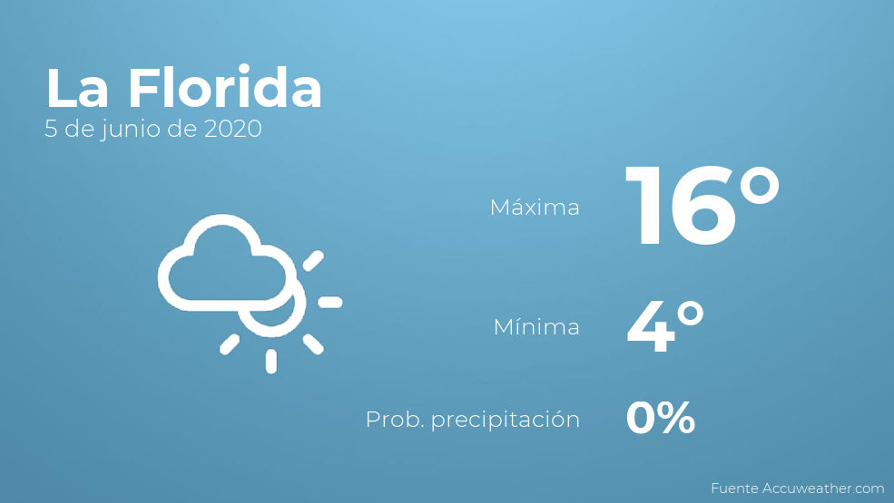 Hoy en La Florida se prevén más nubes que claros. Las temperaturas estarán entre los 16 grados de máxima y 4 de mínima. En general, vientos en calma o flojos de dirección variable.