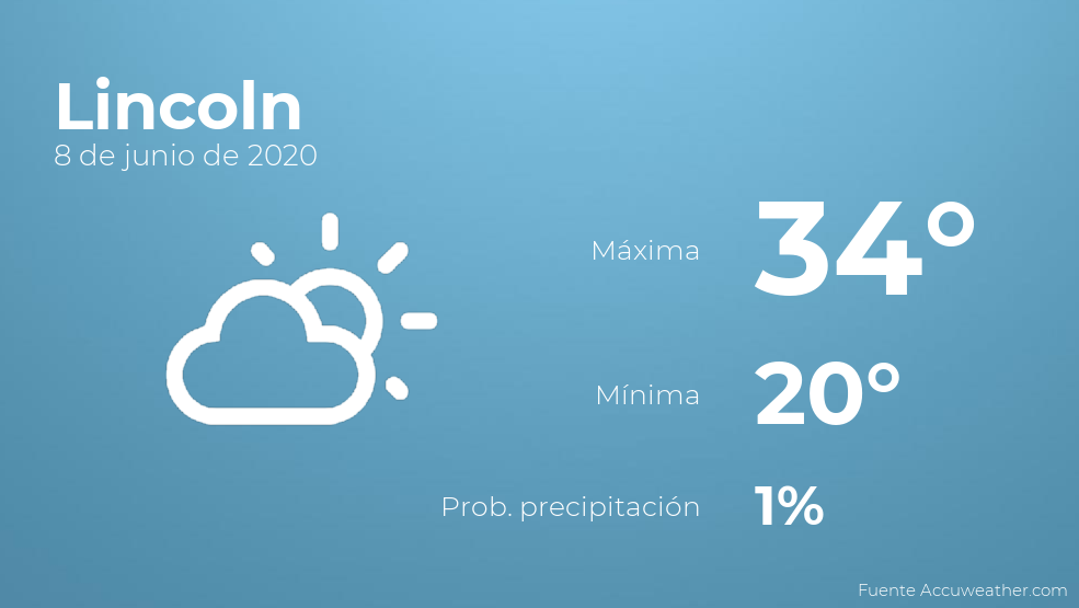 A lo largo de la mañana en Lincoln se prevén pocas nubes. Según pasen las horas se esperan nubes y claros con baja probabilidad de que haya precipitaciones. Con respecto a las temperaturas, oscilarán entre una máxima de 34 y una mínima de 20 grados. En general, vientos con cifras de hasta 41 kilómetros por hora.