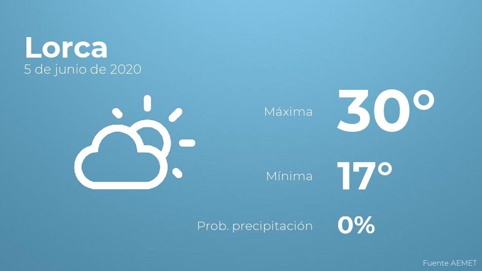 Hoy en Lorca se prevén pocas nubes. En cuanto a las temperaturas, oscilarán entre una máxima de 30 y una mínima de 17 grados centígrados. Viento del oeste de poca intensidad.