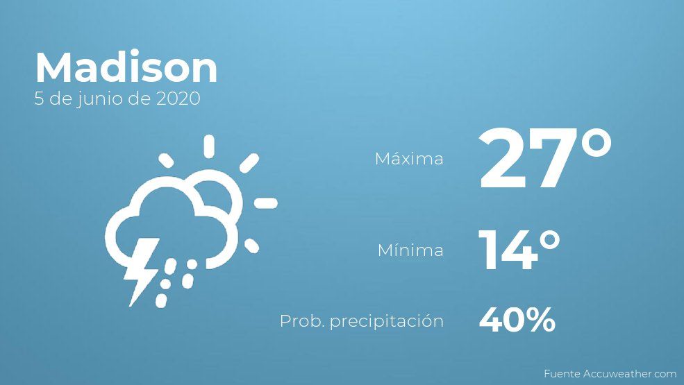 En la mañana de hoy en Madison se prevén nubes y claros con probabilidad de tormentas acompañadas de lluvia. Por la tarde tendremos cielos despejados. En cuanto a las temperaturas, estas se moverán entre una máxima de 27 y una mínima de 14 grados centígrados. Viento del oeste sin apenas intensidad con valores de hasta 18 km/h.