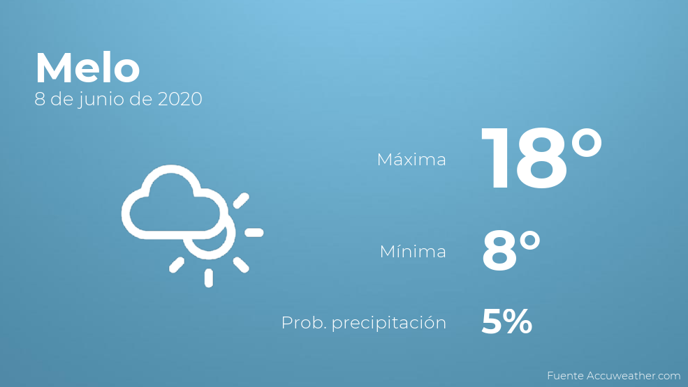 En las primeras horas del día en Melo se esperan más nubes que claros. Por la tarde se prevén nubes y claros. En cuanto a las temperaturas, estarán entre los 18 grados de máxima y 8 de mínima. Además, se esperan vientos del oeste de carácter flojo con cifras de hasta 17 kilómetros por hora.