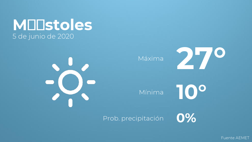 Durante el día de hoy en Móstoles se esperan cielos sin nubes. En relación a las temperaturas, estas oscilarán entre una máxima de 27 y una mínima de 10 grados centígrados. Viento del suroeste sin apenas intensidad.