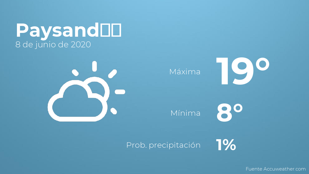 Para el día de hoy en Paysandú se prevé escasa nubosidad. Por lo que respecta a las temperaturas, estas variarán entre una máxima de 19 y una mínima de 8 grados centígrados. Viento de poca intensidad con rachas de hasta 15 km/h.