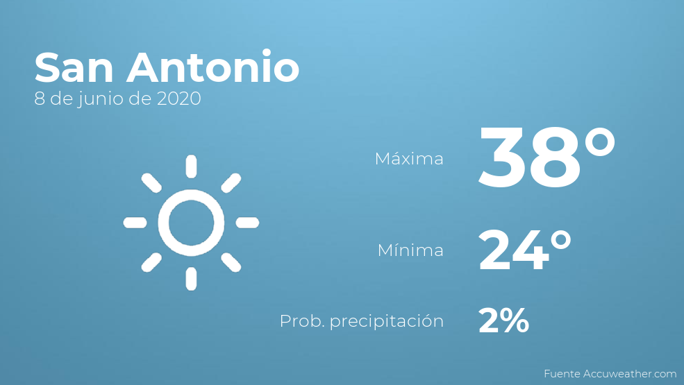 En el día de hoy en San Antonio se esperan cielos sin nubes. En relación a las temperaturas, estas variarán entre los 38 grados de máxima y 24 de mínima. En general, vientos de carácter flojo con valores de hasta 13 kilómetros por hora.