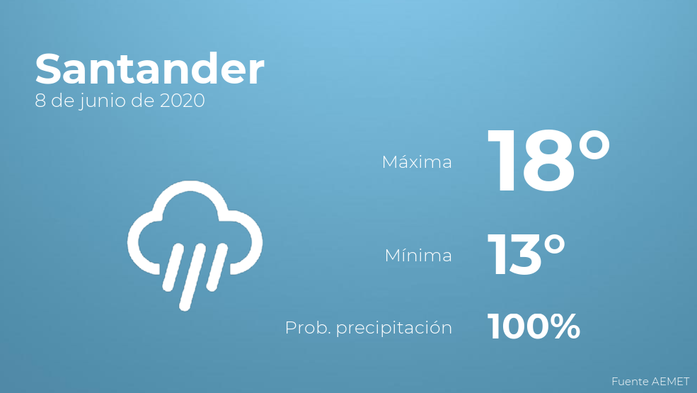 A lo largo del día de hoy en Santander el cielo estará cubierto con lluvia. Con respecto a las temperaturas, oscilarán entre una máxima de 18 y una mínima de 13 grados centígrados. Además, se esperan vientos del noroeste de carácter débil.