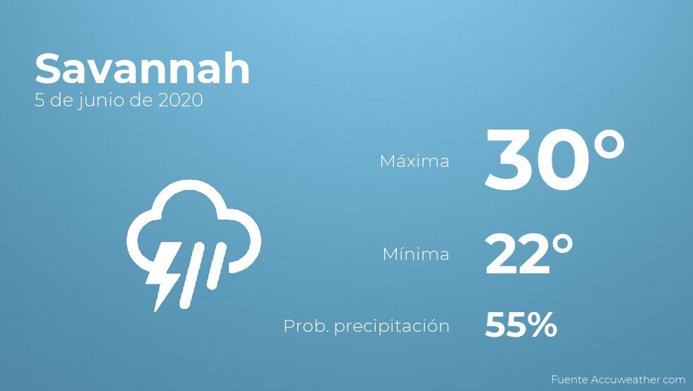Hoy a primera hora en Savannah el cielo estará cubierto con probabilidad de tormentas y lluvia. Por la tarde tendremos nubes y claros con baja probabilidad de que haya precipitaciones. Las temperaturas estarán entre una máxima de 30 y una mínima de 22 grados centígrados. Además, se esperan vientos sin apenas intensidad con valores de hasta 20 kilómetros por hora.