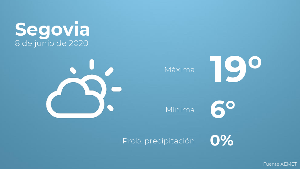 Durante las primeras horas del día en Segovia se esperan cielos sin nubes. Según pasen las horas habrá escasa nubosidad. En relación a las temperaturas, estas oscilarán entre los 19 grados de máxima y 6 de mínima. Junto a todo esto, se esperan vientos del norte de poca intensidad.