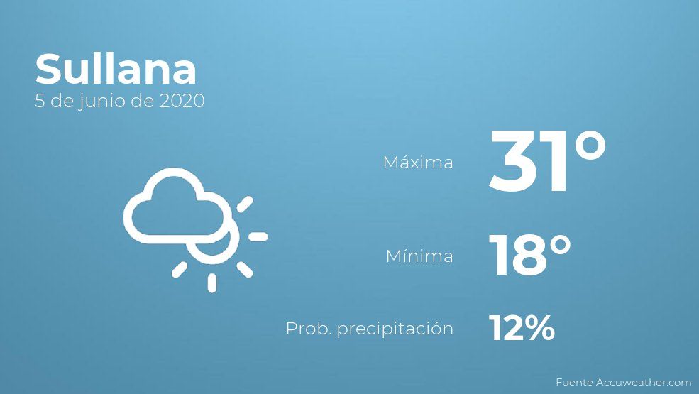 En las primeras horas del día en Sullana habrá más nubes que claros con poca probabilidad de precipitaciones. Según pasen las horas se esperan nubes y claros con escasa probabilidad de precipitaciones. Con respecto a las temperaturas, oscilarán entre una máxima de 31 y una mínima de 18 grados. Junto a todo esto, se esperan vientos de carácter débil con valores de hasta 26 kilómetros por hora.