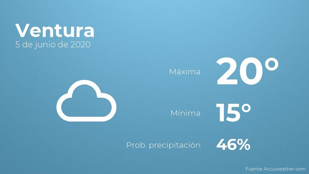 Durante las primeras horas del día en Ventura estará muy nublado con probabilidad de algún episodio de precipitaciones aisladas. A medida que avance el día el cielo estará cubierto con probabilidad de lloviznas generalizadas. Con respecto a las temperaturas, estas se moverán entre los 20 grados de máxima y 15 de mínima. Además, se esperan vientos sin apenas intensidad con valores de hasta 17 kilómetros por hora.