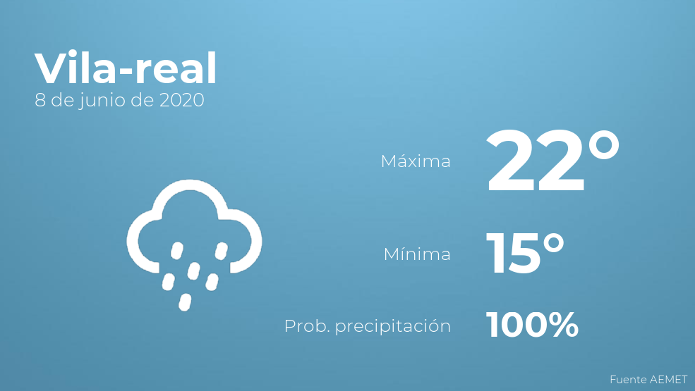 Hoy a primera hora en Vila-real tendremos cielos cubiertos con lluvia. Según pasen las horas habrá cielos nubosos con lluvia. Con respecto a las temperaturas, estas se moverán entre los 22 grados de máxima y 15 de mínima. Además, se esperan vientos del sur de poca intensidad.