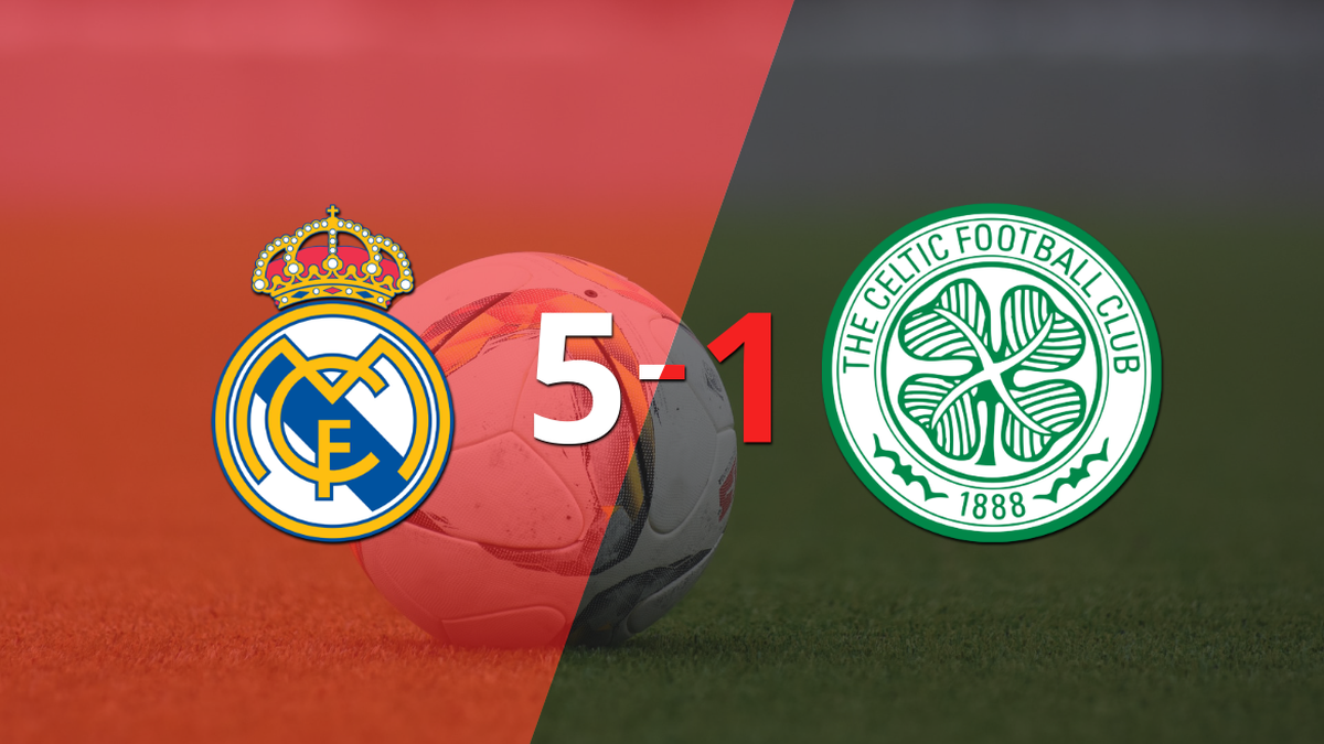 Los Merengues marcaron la diferencia con una goleada en el partido que jugaron este miércoles en el estadio Santiago Bernabéu ante Celtic, en el marco de la fecha 6 del grupo F del torneo UEFA - Champions League 2022-2023. Los goles del partido para el local los anotaron Luka Modric (5' 1T, de penal), Rodrygo (20' 1T, de penal), Marco Asensio (5' 2T), Vinicius Júnior (15' 2T) y Federico Valverde (25' 2T). Mientras que el gol de visitante lo hizo Jota (38' 2T, de tiro libre).