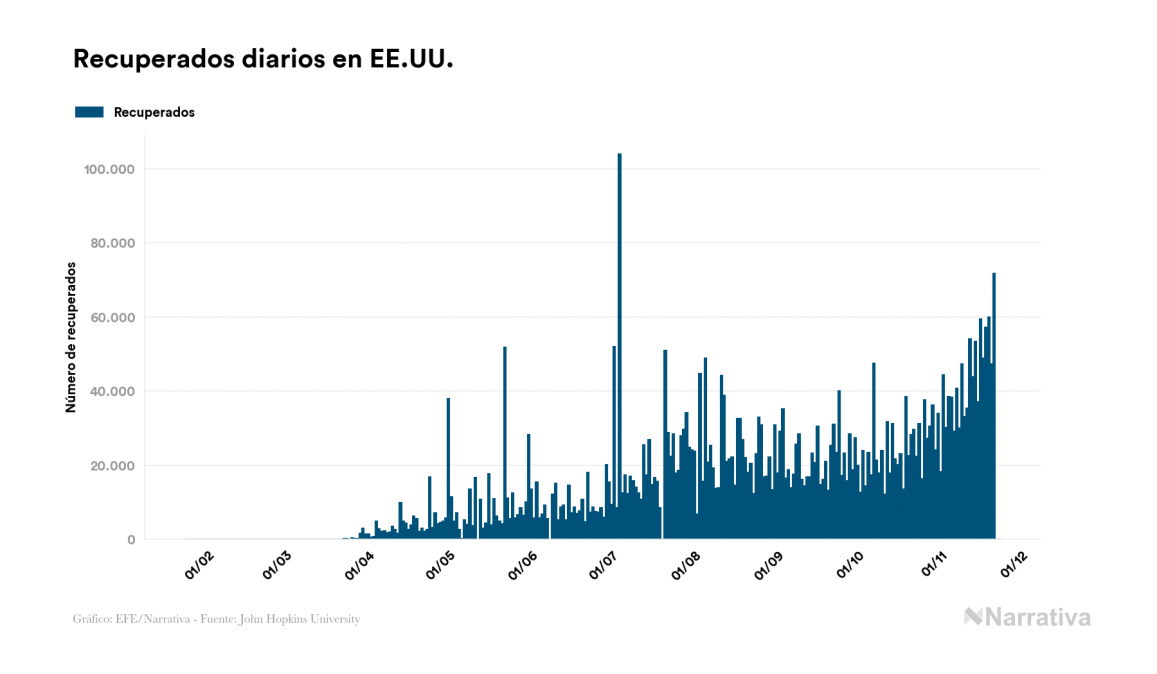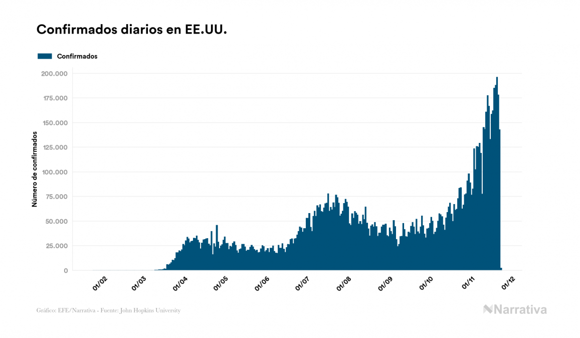 Según los últimos datos, actualmente en EE.UU. hay 7.465.887 casos activos de coronavirus tras confirmarse 2.349 nuevos positivos este lunes. Desde el comienzo de la pandemia, la cifra total de contagiados asciende a 12.249.198, con 4.526.513 recuperados y 256.798 fallecidos.