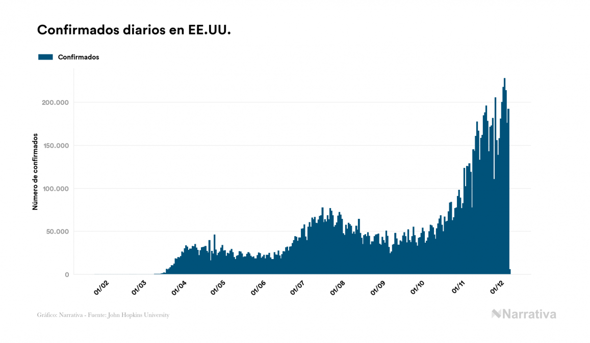 Según los últimos datos, actualmente en EE.UU. hay 8.956.722 casos activos de coronavirus tras confirmarse 5.726 nuevos positivos este martes. Desde el comienzo de la pandemia, el número total de contagiados asciende a 14.955.025, con 5.714.557 recuperados y 283.746 fallecidos.