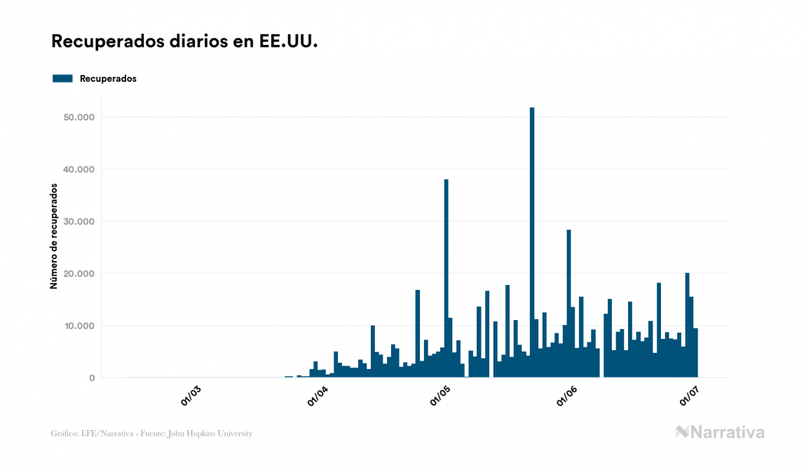 La COVID-19 deja ya 2.686.587 casos de contagio en EE.UU., con 1.828.531 de ellos actualmente activos, 128.062 fallecidos y 4.317 nuevos positivos, según los últimos datos correspondientes al 2 de julio. Además, desde el primer caso se han recuperado 729.994 personas.