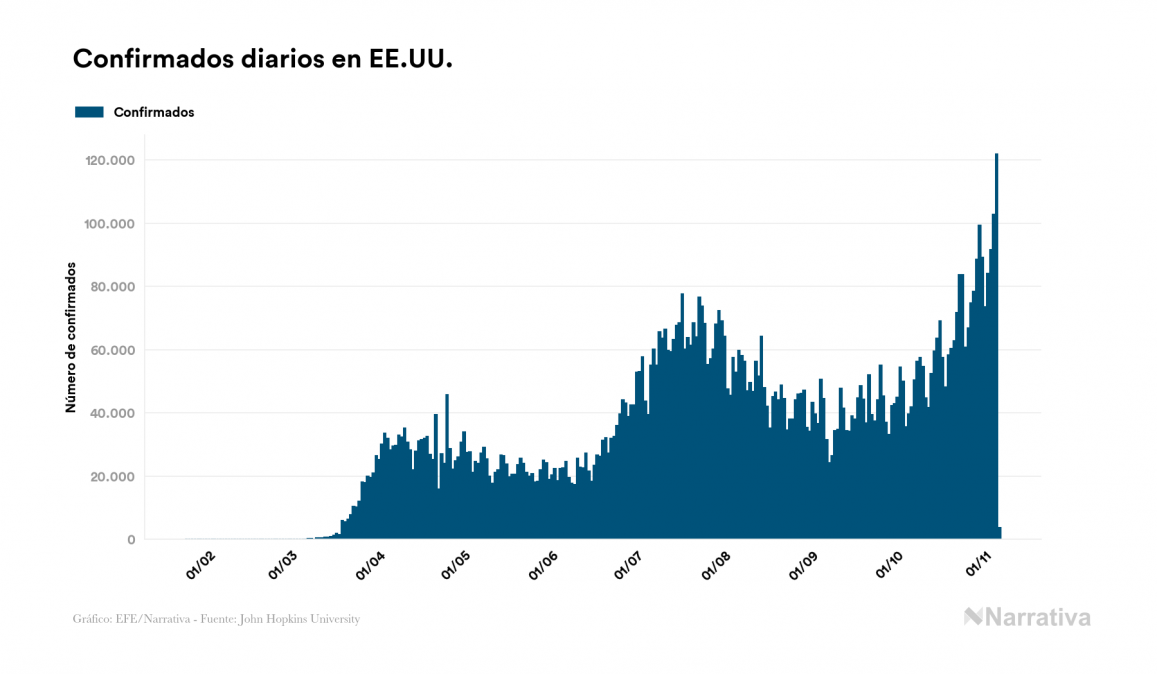 El nuevo coronavirus deja ya 9.610.965 casos de contagio en EE.UU., con 5.594.270 de ellos actualmente activos, 234.944 fallecidos y 3.629 nuevos positivos, según los últimos datos correspondientes al 6 de noviembre. Además, desde el primer caso se han recuperado 3.781.751 personas.