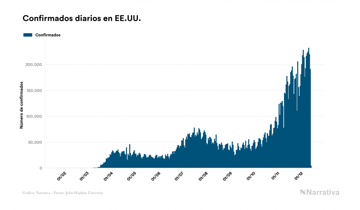 Según los últimos datos, EE.UU. continúa con 9.660.093 casos activos de coronavirus tras confirmarse 4.147 nuevos positivos este lunes. Desde el comienzo de la pandemia, el número total de contagiados asciende a 16.257.366, con 6.298.082 recuperados y 299.191 fallecidos.