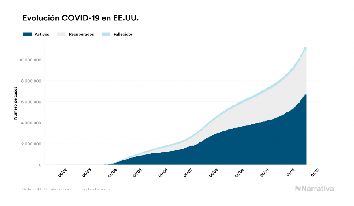 Según los últimos datos, EE.UU. continúa con 6.714.014 casos activos de coronavirus tras confirmarse 3.074 nuevos positivos este martes. Desde el comienzo de la pandemia, el número total de contagiados asciende a 11.206.054, con 4.244.811 recuperados y 247.229 fallecidos.