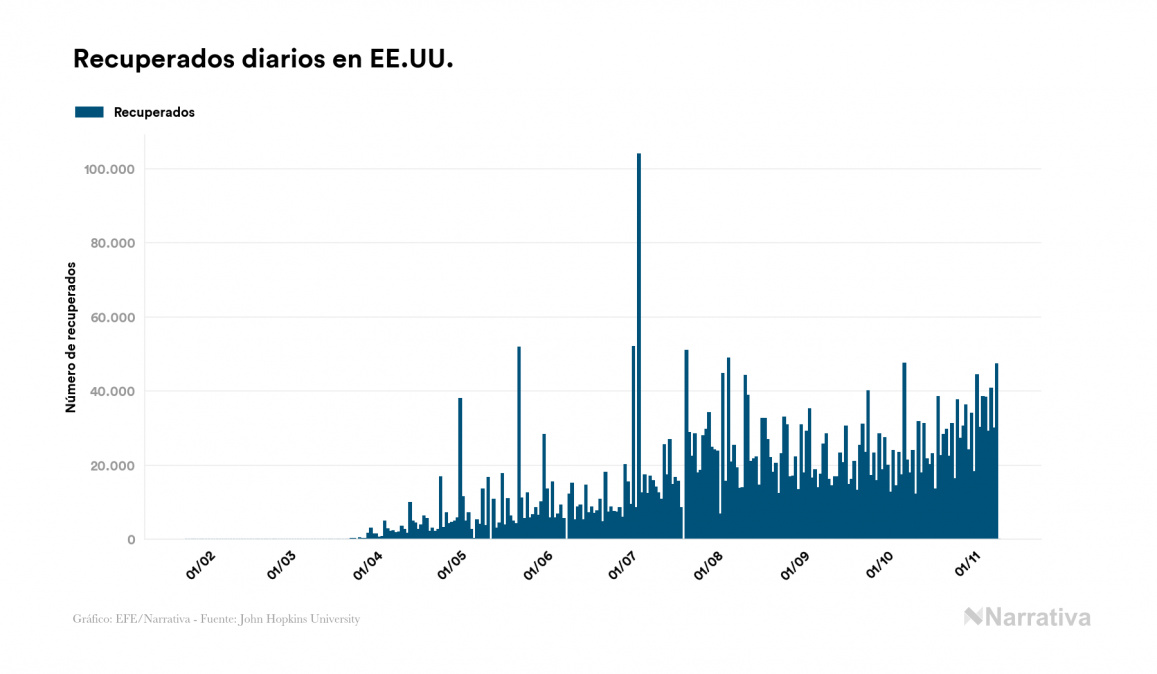 La COVID-19 deja ya 10.111.077 casos de contagio en EE.UU., con 5.943.976 de ellos actualmente activos y 238.256 fallecidos, según los últimos datos correspondientes al 10 de noviembre. Además, un total de 3.928.845 personas ya se ha recuperado desde que se produjo el primer contagio en el país.