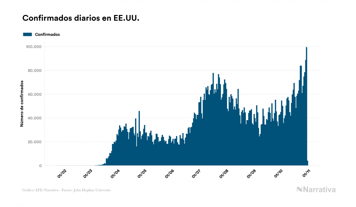 La COVID-19 deja ya 9.048.177 casos de contagio en EE.UU., con 5.240.015 de ellos actualmente activos, 229.710 fallecidos y 3.922 nuevos positivos, según los últimos datos correspondientes al 31 de octubre. Además, desde el primer positivo se han recuperado 3.578.452 personas.