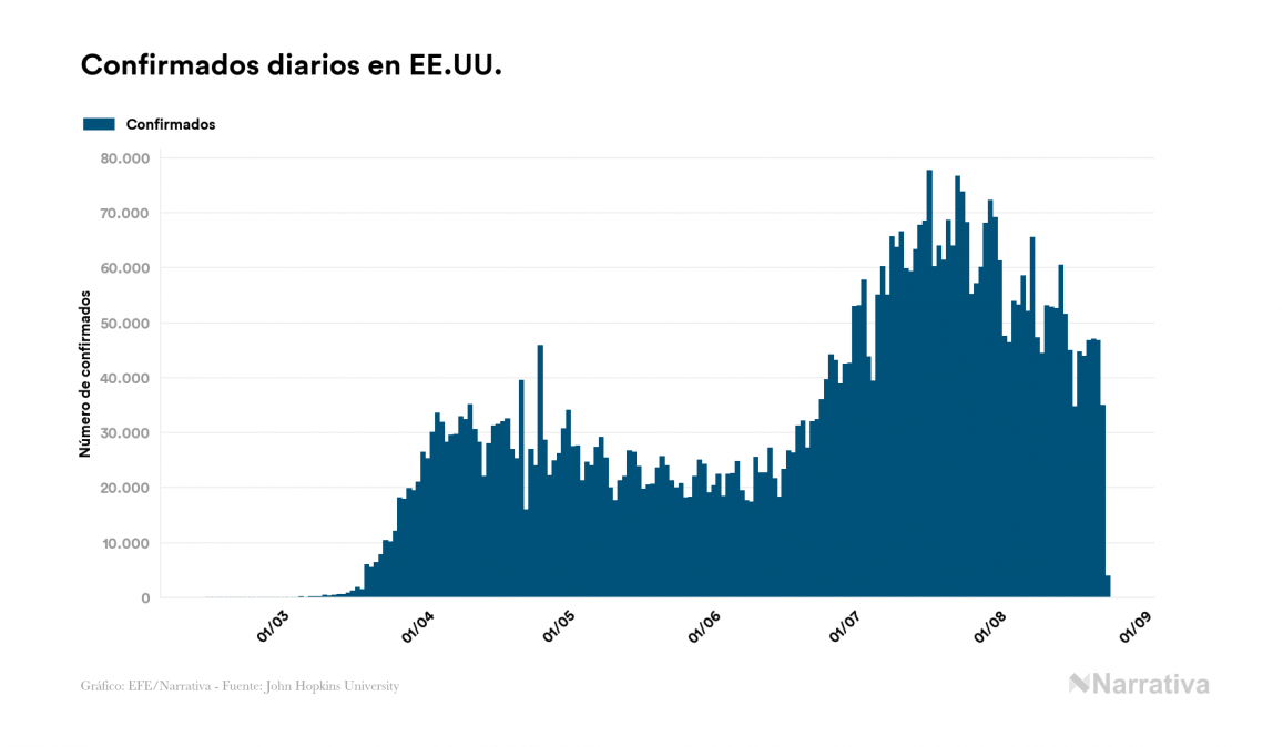 Según los últimos datos, actualmente en EE.UU. hay 3.529.155 casos activos de coronavirus tras confirmarse 3.921 nuevos positivos este lunes. Desde el comienzo de la pandemia, la cifra total de contagiados asciende a 5.703.725, con 1.997.761 recuperados y 176.809 fallecidos.