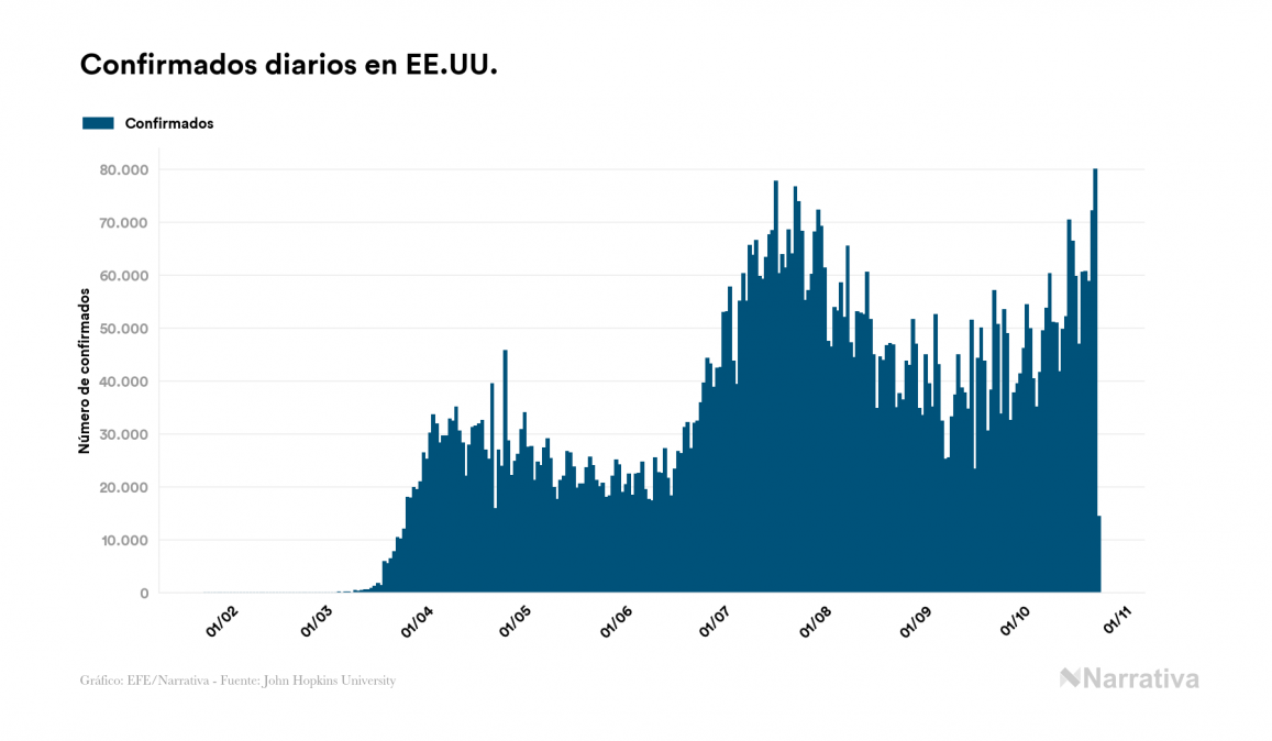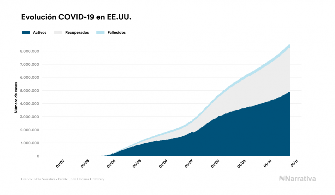 Según los últimos datos, actualmente en EE.UU. hay 4.894.619 casos activos de coronavirus tras confirmarse 14.392 nuevos positivos este sábado. Desde el comienzo de la pandemia, la cifra total de contagiados asciende a 8.494.044, con 3.375.427 recuperados y 223.998 fallecidos.