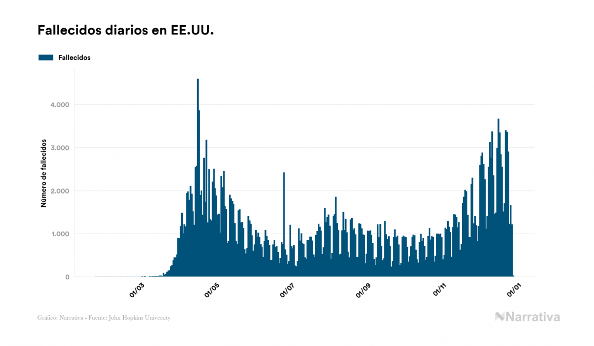 Según los últimos datos, EE.UU. continúa con 11.273.194 casos activos de COVID-19 tras confirmarse 4.032 nuevos positivos y 56.812 altas médicas este lunes. Desde el comienzo de la pandemia, el número total de contagiados asciende a 19.136.758, con 7.530.424 recuperados y 333.140 fallecidos.