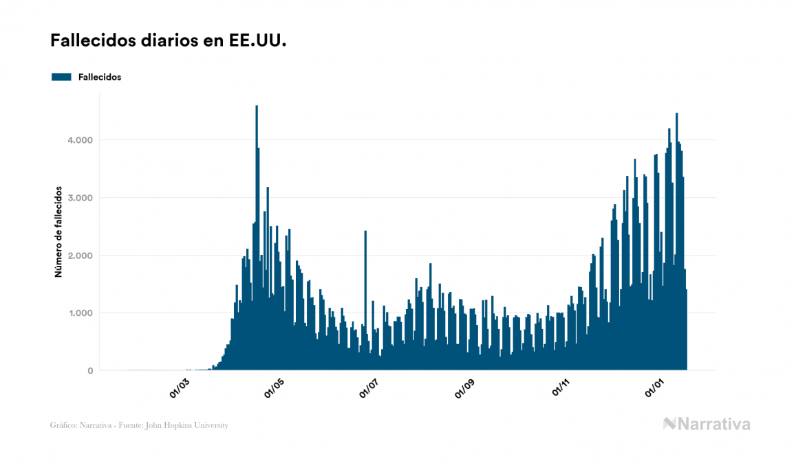 Según los últimos datos, EE.UU. continúa con 14.195.879 casos activos de COVID-19 tras confirmarse 433 nuevos positivos este martes. Desde el comienzo de la pandemia, la cifra total de contagiados asciende a 24.079.205, con 9.484.323 recuperados y 399.003 fallecidos.