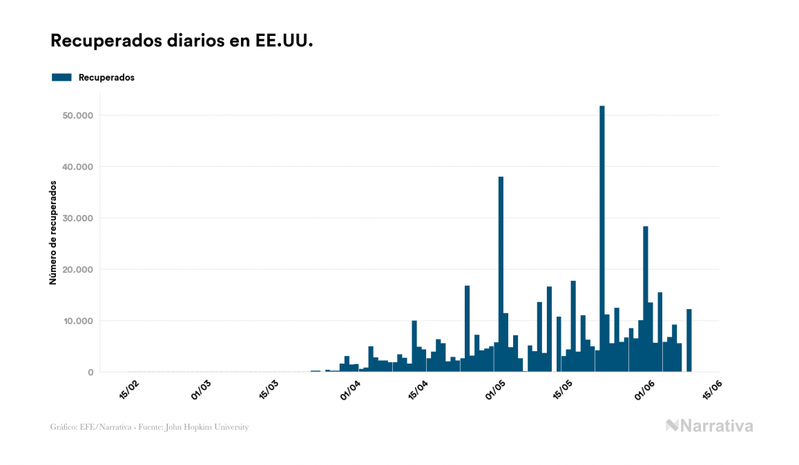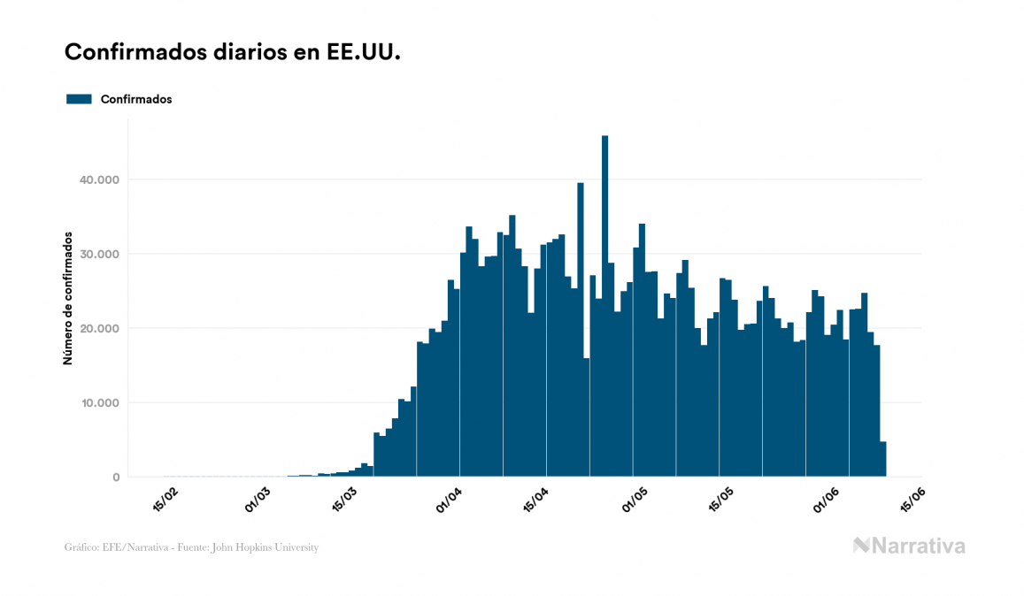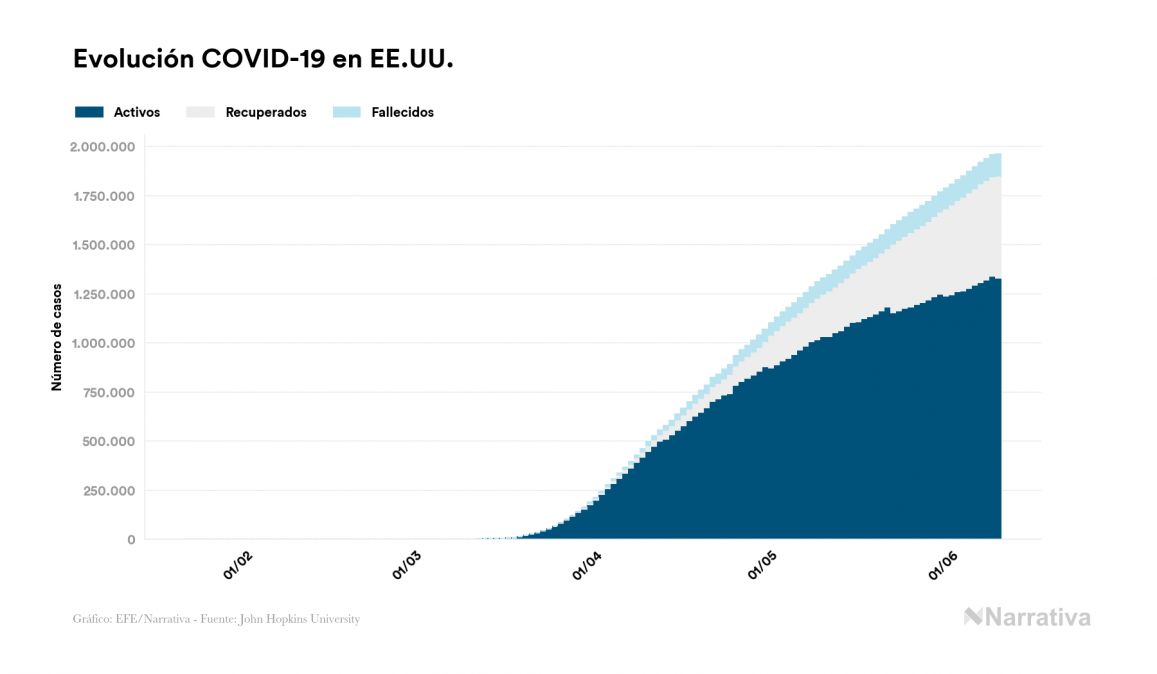 Según los últimos datos, actualmente en EE.UU. hay 1.331.656 casos activos de COVID-19 tras confirmarse 4.686 nuevos positivos y 12.155 altas médicas este martes. Desde el comienzo de la pandemia, el número total de contagiados asciende a 1.961.185, con 518.522 recuperados y 111.007 fallecidos.