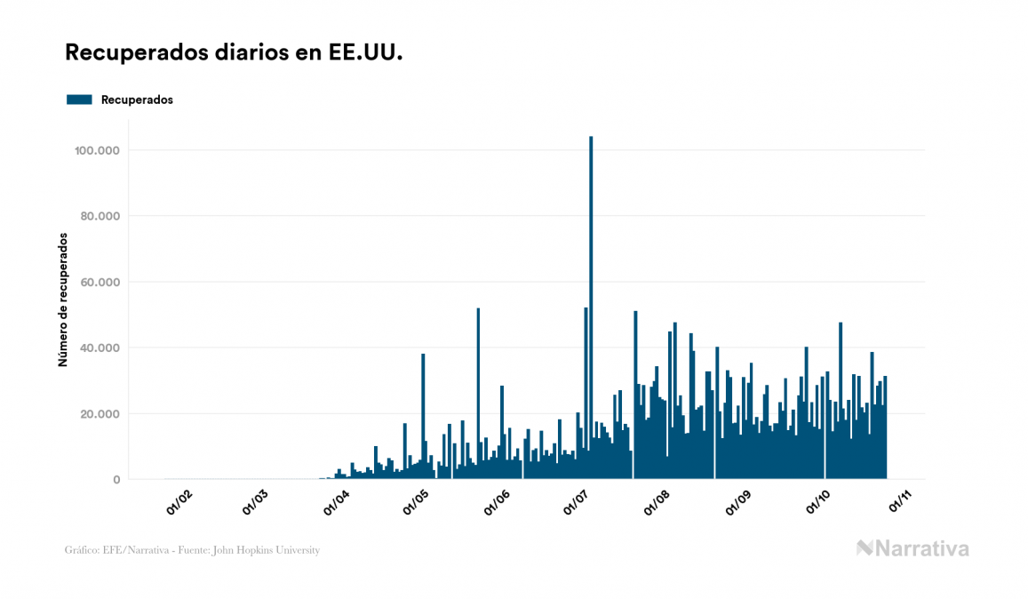 El coronavirus deja ya 8.578.063 casos de contagio en EE.UU., con 4.946.501 de ellos actualmente activos, 224.906 fallecidos y 9.438 nuevos positivos, según los últimos datos correspondientes al 25 de octubre. Además, desde el primer caso se han recuperado 3.406.656 personas.