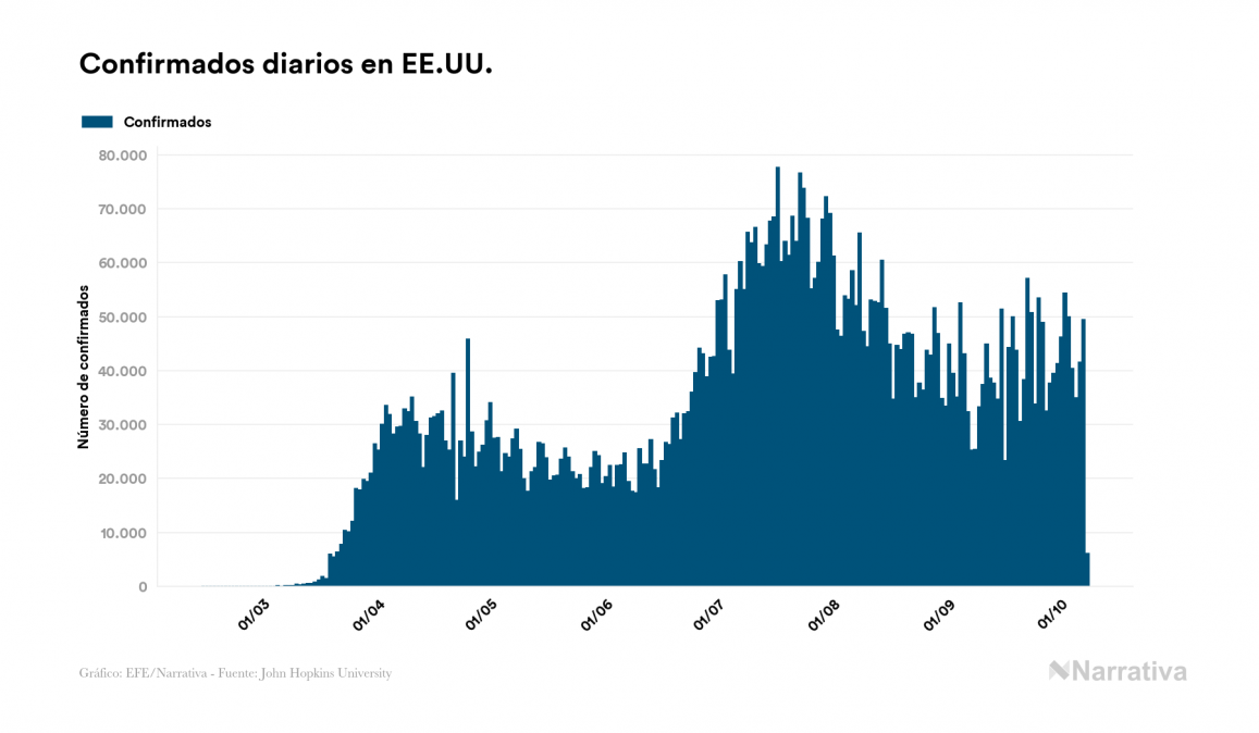 La COVID-19 deja ya 7.550.731 casos de contagio en EE.UU., con 4.339.002 de ellos actualmente activos, 211.834 fallecidos y 6.119 nuevos positivos, según los últimos datos correspondientes al 8 de octubre. Además, desde el primer positivo se han recuperado 2.999.895 personas.