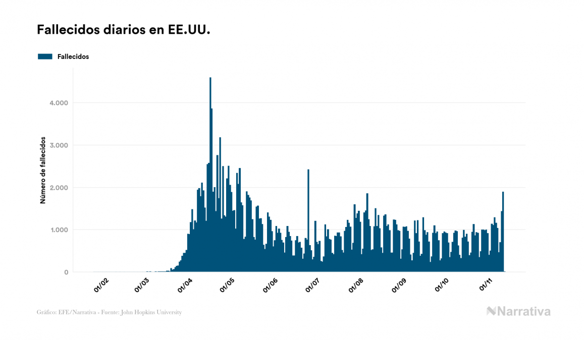 La COVID-19 deja ya 10.402.274 casos de contagio en EE.UU., con 6.163.291 de ellos actualmente activos, 241.808 fallecidos y 2.047 nuevos positivos, según los últimos datos correspondientes al 12 de noviembre. Además, desde el primer positivo se han recuperado 3.997.175 personas.