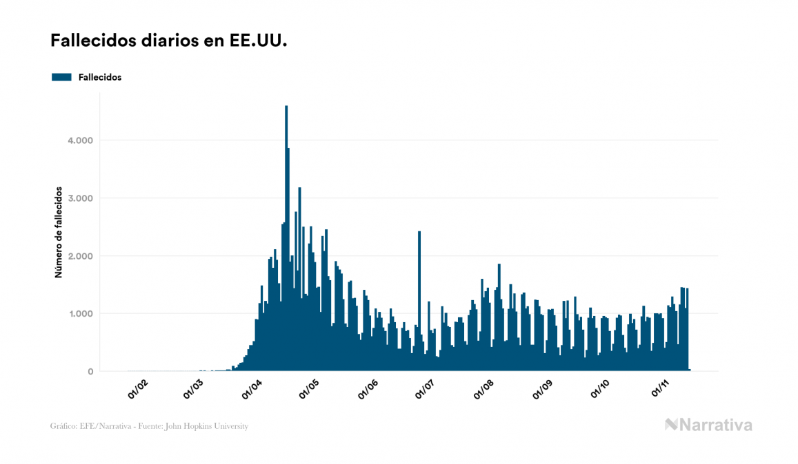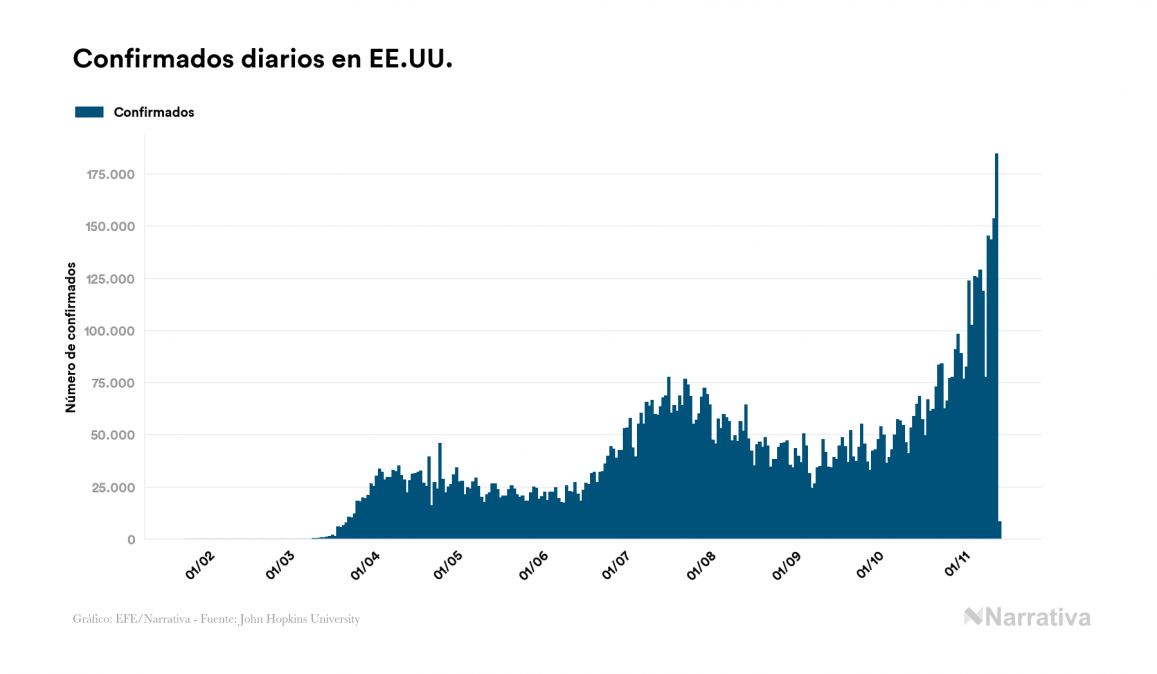 Según los últimos datos, actualmente en EE.UU. hay 6.406.014 casos activos de coronavirus tras confirmarse 8.189 nuevos positivos este sábado. Desde el comienzo de la pandemia, la cifra total de contagiados asciende a 10.745.524, con 4.095.146 recuperados y 244.364 fallecidos.