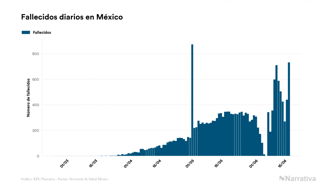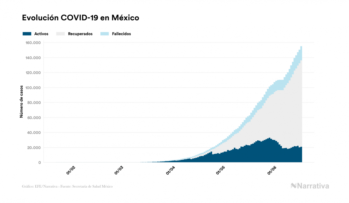 Según los últimos datos, México continúa con 21.159 casos activos de COVID-19 tras confirmarse 4.599 nuevos positivos y 3.102 altas médicas este miércoles. Desde el comienzo de la pandemia, la cifra total de contagiados asciende a 154.863, con 115.394 recuperados y 18.310 fallecidos.