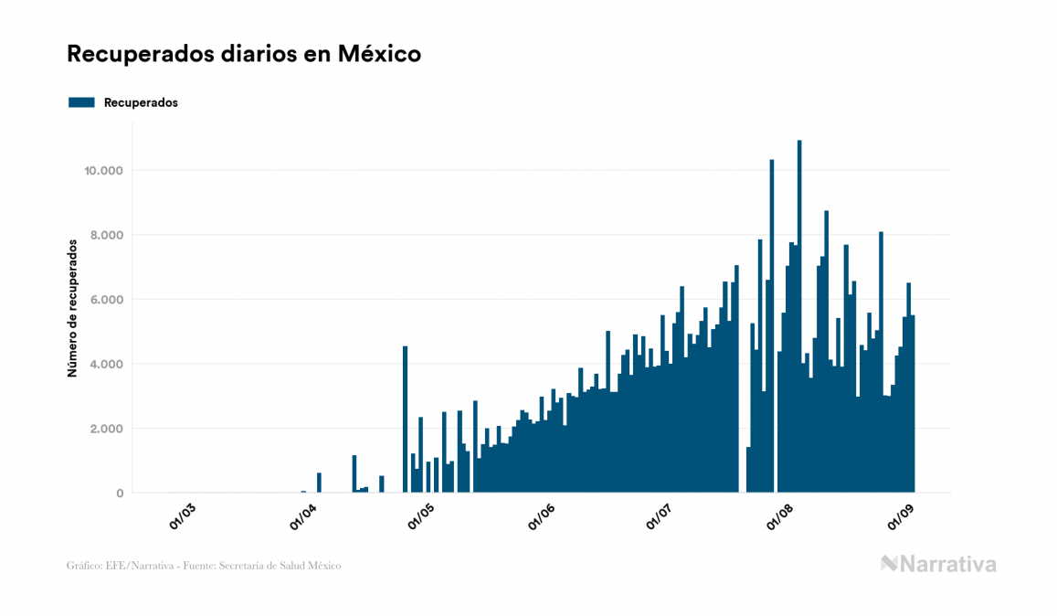 Según los últimos datos, actualmente en México hay 39.073 casos activos de COVID-19 tras confirmarse 6.476 nuevos positivos y 5.500 altas médicas este miércoles. Desde el comienzo de la pandemia, el número total de contagiados asciende a 606.036, con 501.722 recuperados y 65.241 fallecidos.