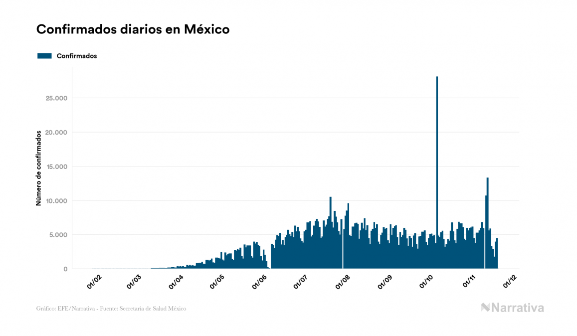 El coronavirus deja ya 1.019.543 casos de contagio en México, con 153.078 de ellos actualmente activos y 100.104 fallecidos, según los últimos datos correspondientes al 20 de noviembre. Además, un total de 766.361 personas ya se ha recuperado desde que se produjo el primer contagio en el país.