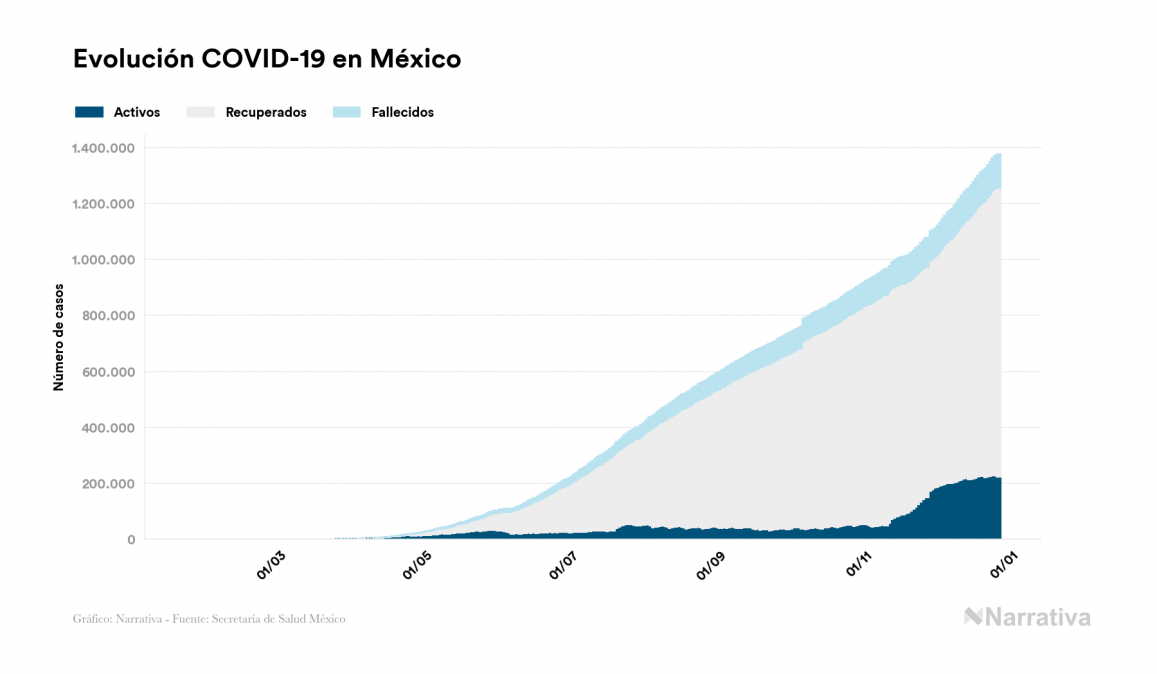 El nuevo coronavirus deja ya 1.377.217 casos de contagio en México, con 223.327 de ellos actualmente activos y 122.026 fallecidos, según los últimos datos correspondientes al 27 de diciembre. Además, un total de 1.031.864 personas ya se ha recuperado desde que se produjo el primer contagio en el país.