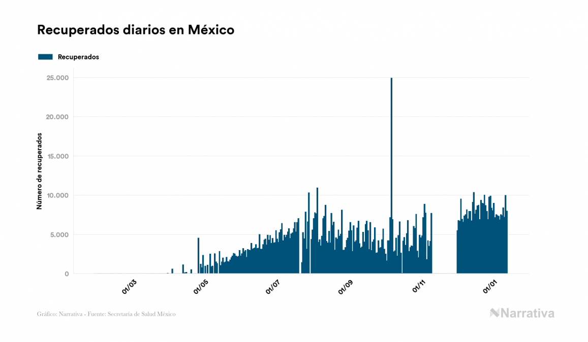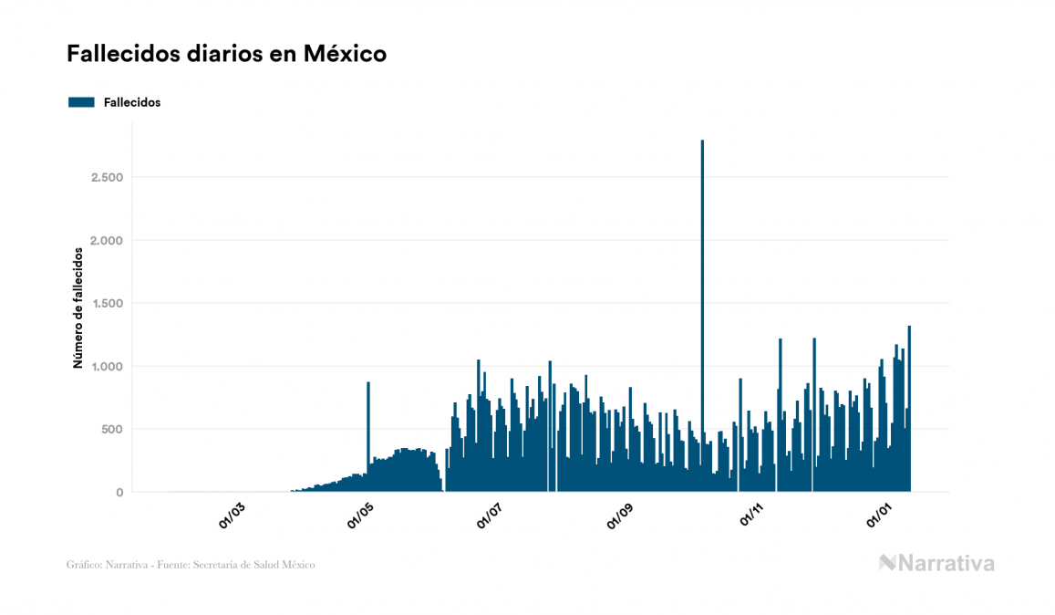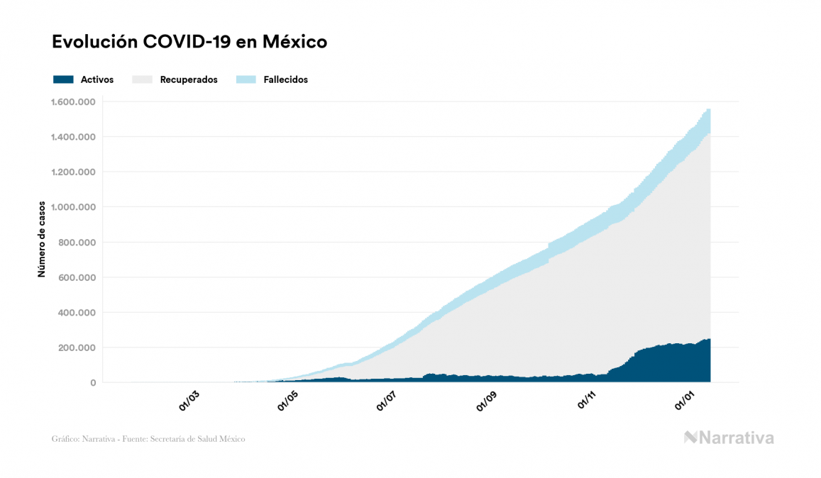 El coronavirus deja ya 1.556.028 casos de contagio en México, con 251.992 de ellos actualmente activos y 135.682 fallecidos, según los últimos datos correspondientes al 13 de enero. Además, un total de 1.168.354 personas ya se ha recuperado desde que se produjo el primer contagio en el país.