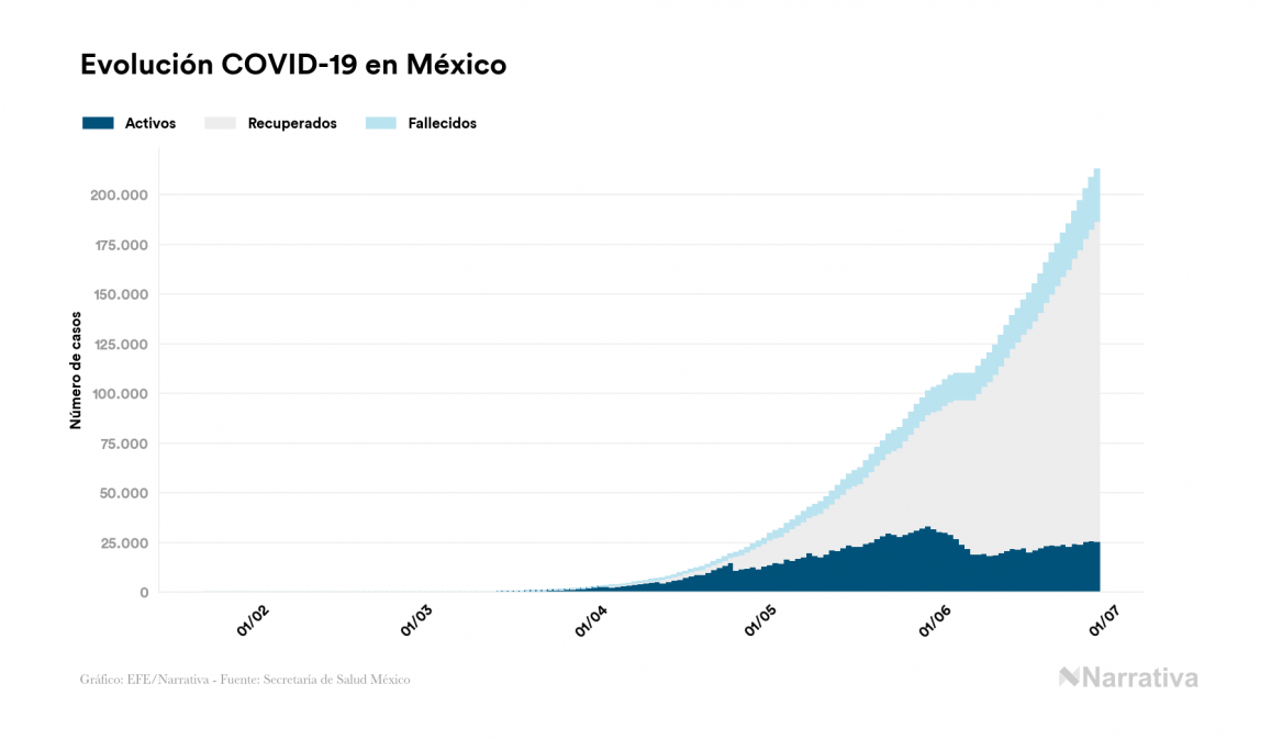 Según los últimos datos, actualmente en México hay 25.700 casos activos de COVID-19 tras confirmarse 4.410 nuevos positivos y 3.894 altas médicas este domingo. Desde el comienzo de la pandemia, la cifra total de contagiados asciende a 212.802, con 160.721 recuperados y 26.381 fallecidos.