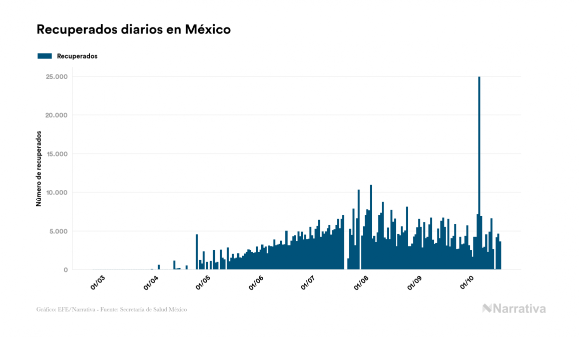 Según los últimos datos, actualmente en México hay 45.201 casos activos de COVID-19 tras confirmarse 5.447 nuevos positivos y 3.598 altas médicas este domingo. Desde el comienzo de la pandemia, la cifra total de contagiados asciende a 847.108, con 715.848 recuperados y 86.059 fallecidos.