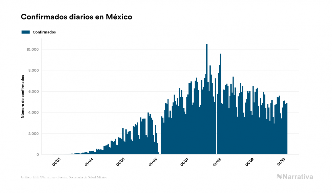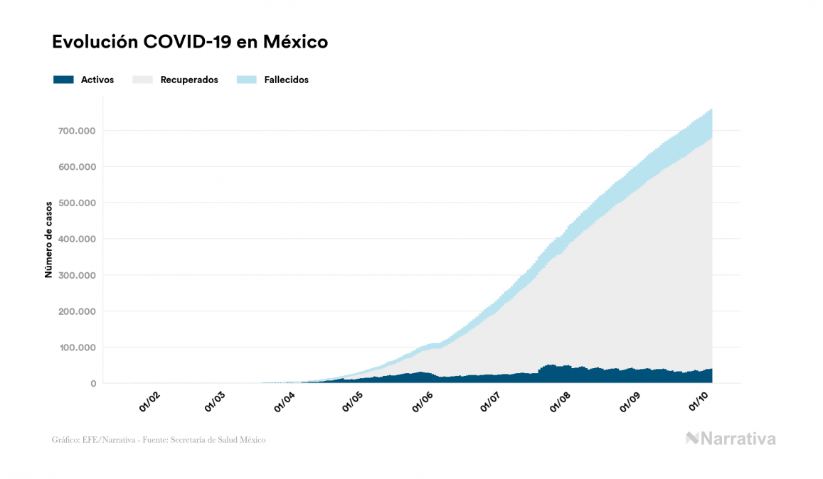 Según los últimos datos, actualmente en México hay 41.080 casos activos de COVID-19 tras confirmarse 4.863 nuevos positivos y 4.187 altas médicas este domingo. Desde el comienzo de la pandemia, la cifra total de contagiados asciende a 757.953, con 637.993 recuperados y 78.880 fallecidos.