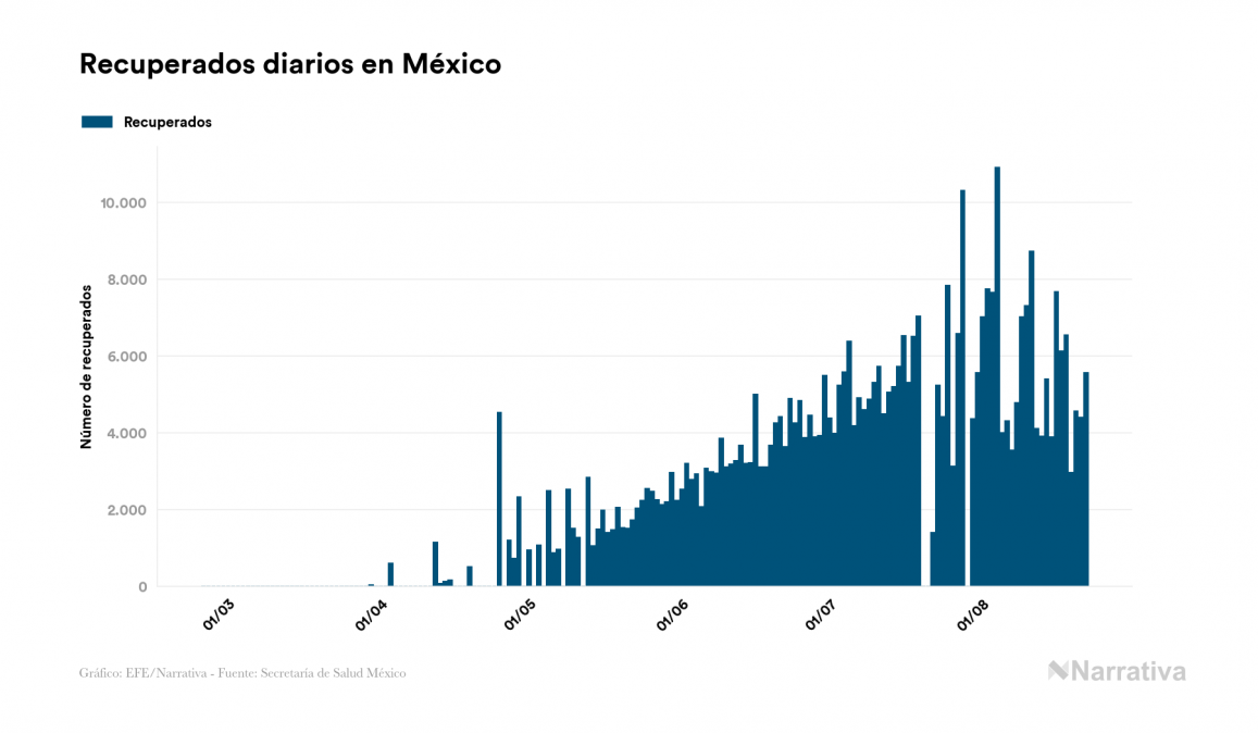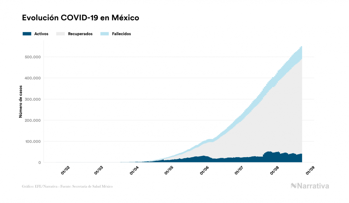 Según los últimos datos, actualmente en México hay 41.780 casos activos de COVID-19 tras confirmarse 5.928 nuevos positivos y 5.562 altas médicas este sábado. Desde el comienzo de la pandemia, el número total de contagiados asciende a 549.734, con 448.344 recuperados y 59.610 fallecidos.