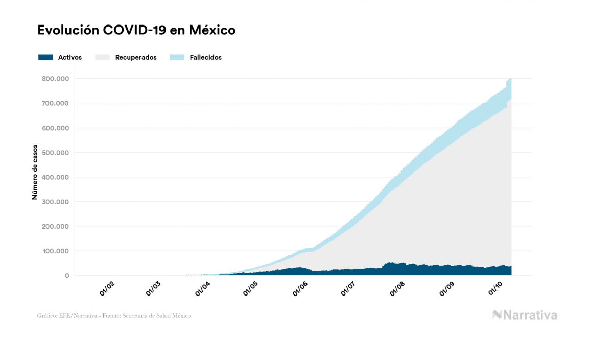 Según los últimos datos, México continúa con 36.769 casos activos de COVID-19 tras confirmarse 4.580 nuevos positivos y 2.770 altas médicas este jueves. Desde el comienzo de la pandemia, el número total de contagiados asciende a 799.188, con 679.693 recuperados y 82.726 fallecidos.